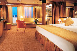 These extra-large accommodations have a separate sitting area and private balcony. Special features include a large vanity/dressing table, refrigerator and entertainment area, VCR and access to an extensive video library, whirlpool bath and walk-in closet.